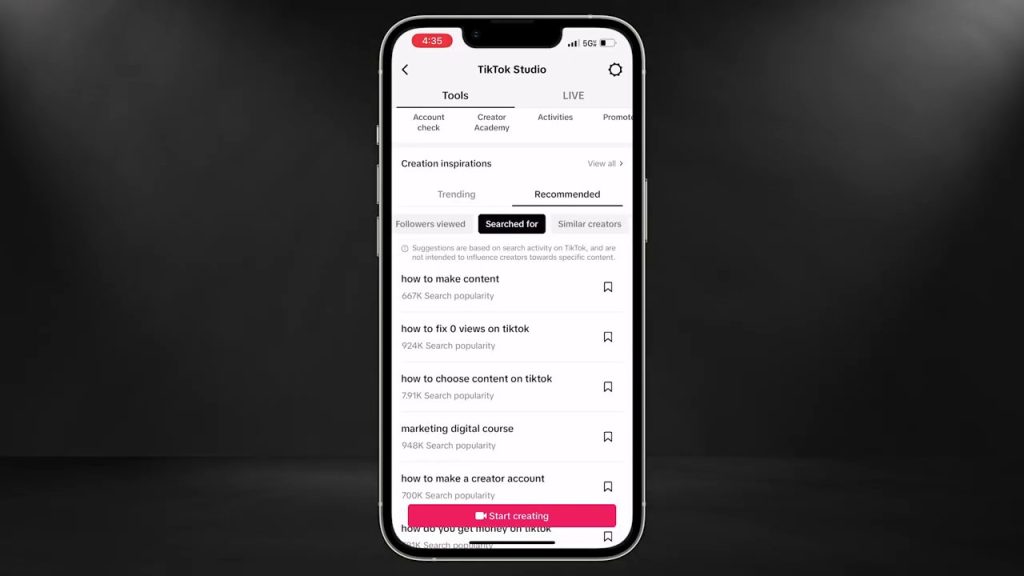 1. TikTok Studio’s “Creation Inspirations”: Navigate to TikTok Studio on your account and scroll down to “Creation Inspirations.” This tool shows you what’s trending across TikTok in general. The “Recommended” tab is particularly powerful, as it reveals content that your own followers have searched for and viewed, giving you direct insight into your audience’s interests.